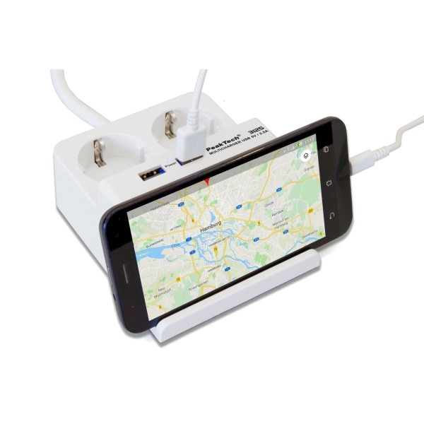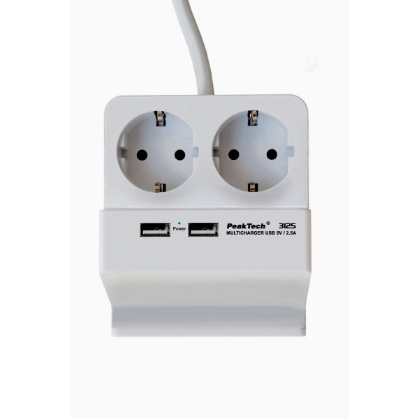 PeakTech 3125 - Dual Battery Charger 2.5 A with USB Socket and Support for Cell Phone, with 2 Schuko 230 V Sockets