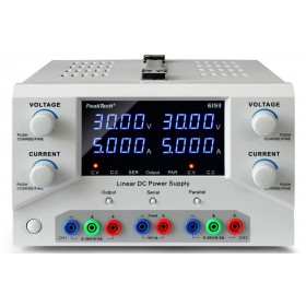 Fuente de Alimentación de Laboratorio CC, 2x 0-30V 0-5A, 5V 1A, Controlado via USB, Instrumentos Digitales para Voltaje, y Corriente Fuente de alimentación lineal de laboratorio fiable y segura gracias al transformador de aislamiento integrado. Dos salidas regulables de 0 a 30 V y de 0 a 5 A y una salida de tensión fija de 5V 1A. Valores configurables de forma rápida y precisa con ajuste grueso y fino. Las salidas pueden conectarse en serie o en paralelo mediante los botones "Serial" o "Parallel". Los valores se aplican al pulsar "Output", evitando cambios involuntarios. Las pantallas LED azules de 4 dígitos indican con precisión voltaje y corriente. Suministrado con cable de alimentación IEC con enchufe EU. También disponible con enchufe UK o US sin coste adicional. Especificar...