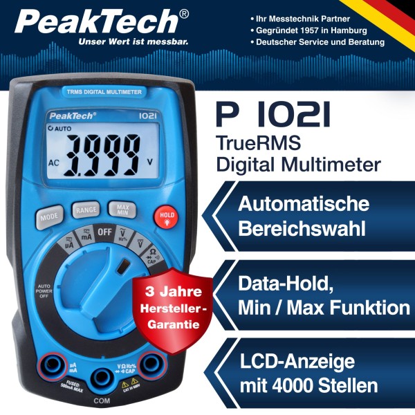 PeakTech 1021 - Multímetro Digital Auto Rango TrueRMS 3 2/3 dígitos (3999) 13 mm