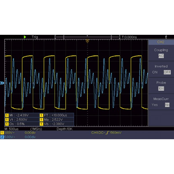 2-channel digital storage oscilloscope of the latest generation for the education and professional sector with high-resolution TFT color display and comprehensive additional functions.