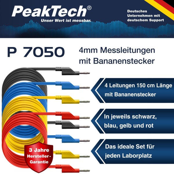 PeakTech 7050 - Jeu de 4 Câbles de 150 cm avec Fiches Banane de 4 mm pour Laboratoire ou Expériences