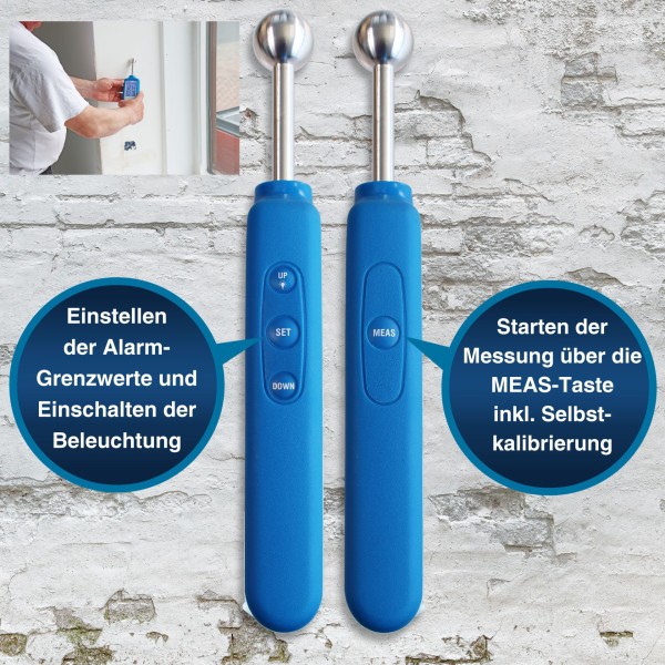 Ce testeur pratique est particulièrement adapté pour le contrôle préalable des murs avant des travaux ultérieurs tels que l'enduisage, la pose de papier peint ou la peinture, ainsi que pour l'évaluation générale du risque de moisissure dans les bâtiments résidentiels ou la recherche de dommages liés à l'humidité.