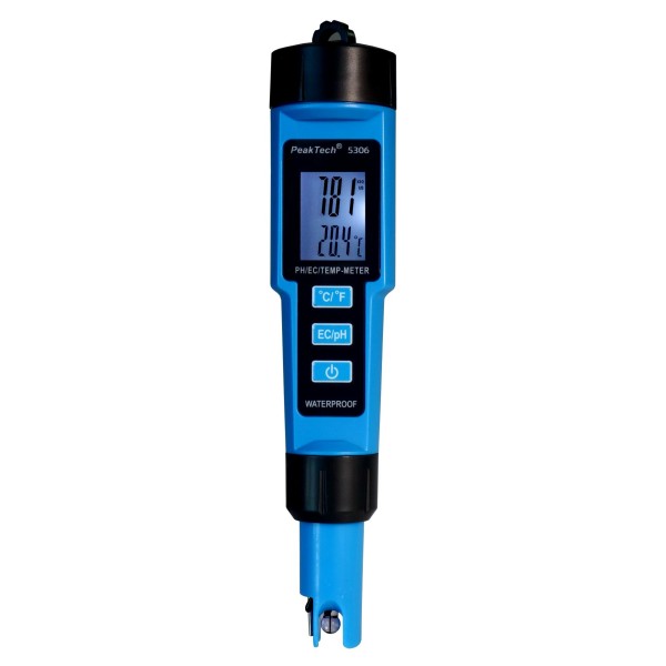 PeakTech 5306 è un misuratore di pH 3-in-1 che si adopera facilmente con una sola mano e misura contemporaneamente, il pH o la Conducibilità Elettrica (EC) in µS/cm, e la temperatura in °C or °F di un liquido.