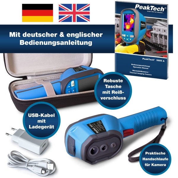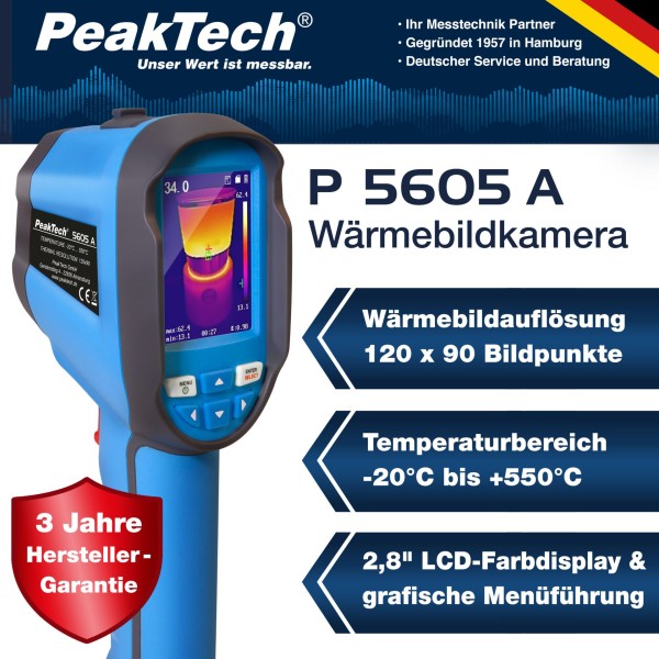 PeakTech 5605 A è una termocamera versatile con una risoluzione termica di 120x90 pixel, che rende facile rilevare le differenze di temperatura.