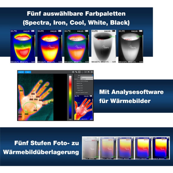 Il dispositivo offre anche cinque diverse palette di colori per l’imaging termico e cinque modalità di sovrapposizione di video o foto con immagine termica, facilitando l’individuazione dell’origine del guasto nell’immagine reale o nelle sovrapposizioni.